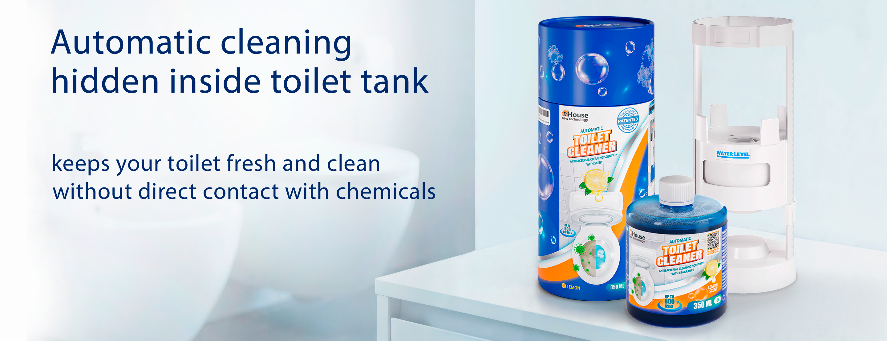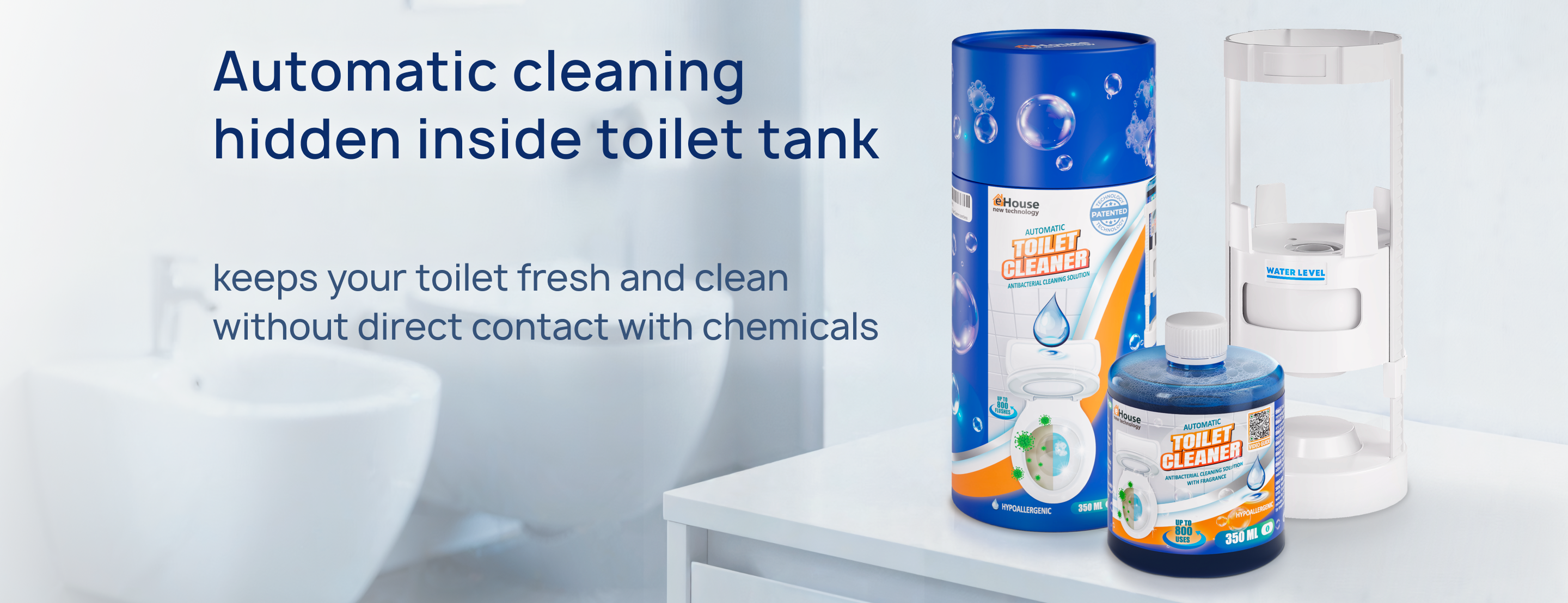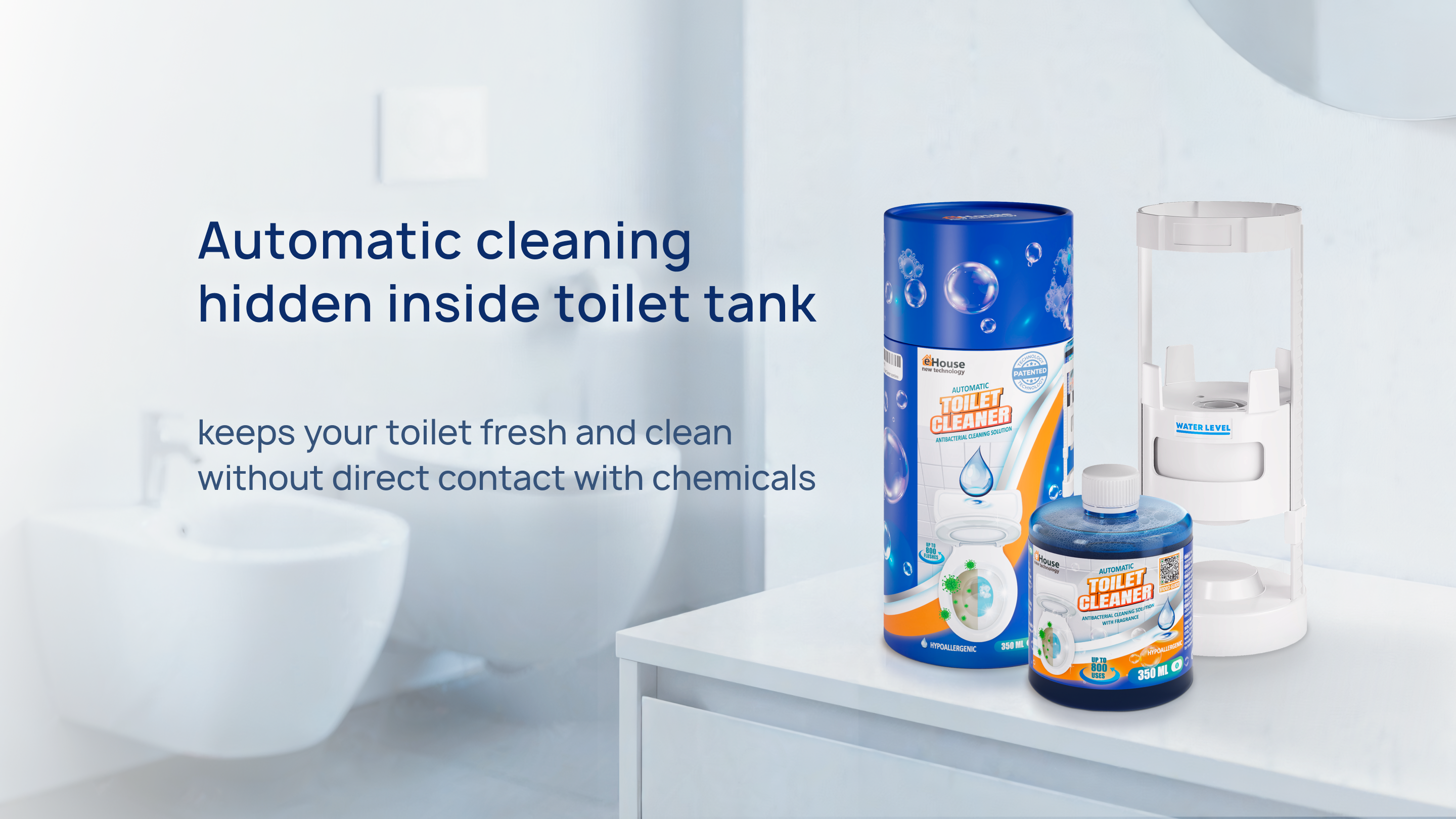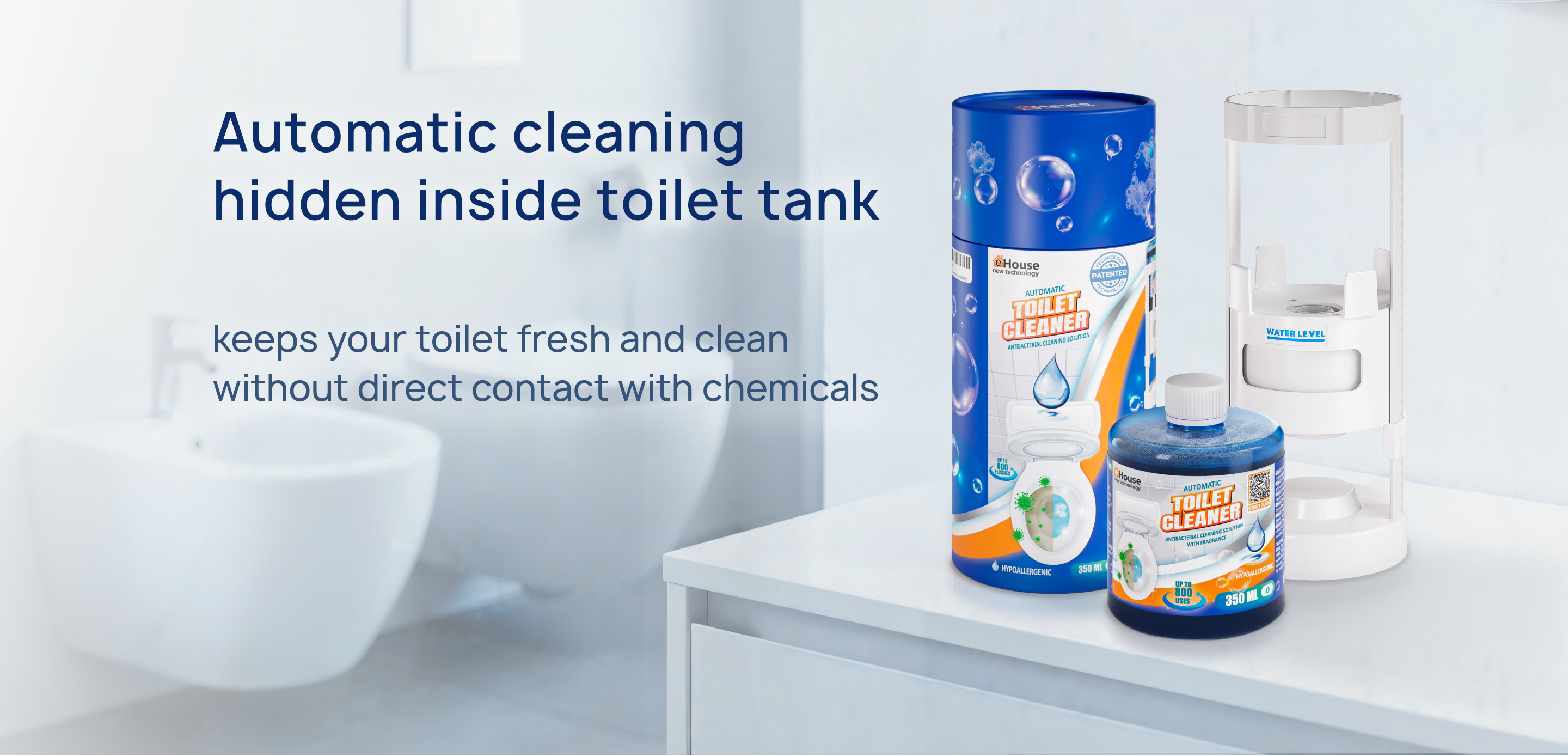 eHouse is a hidden toilet cleaning system installed inside your tank. It works automatically with every flush, keeping the bowl clean and fresh — without sprays, hanging blocks, or direct contact with chemicals.